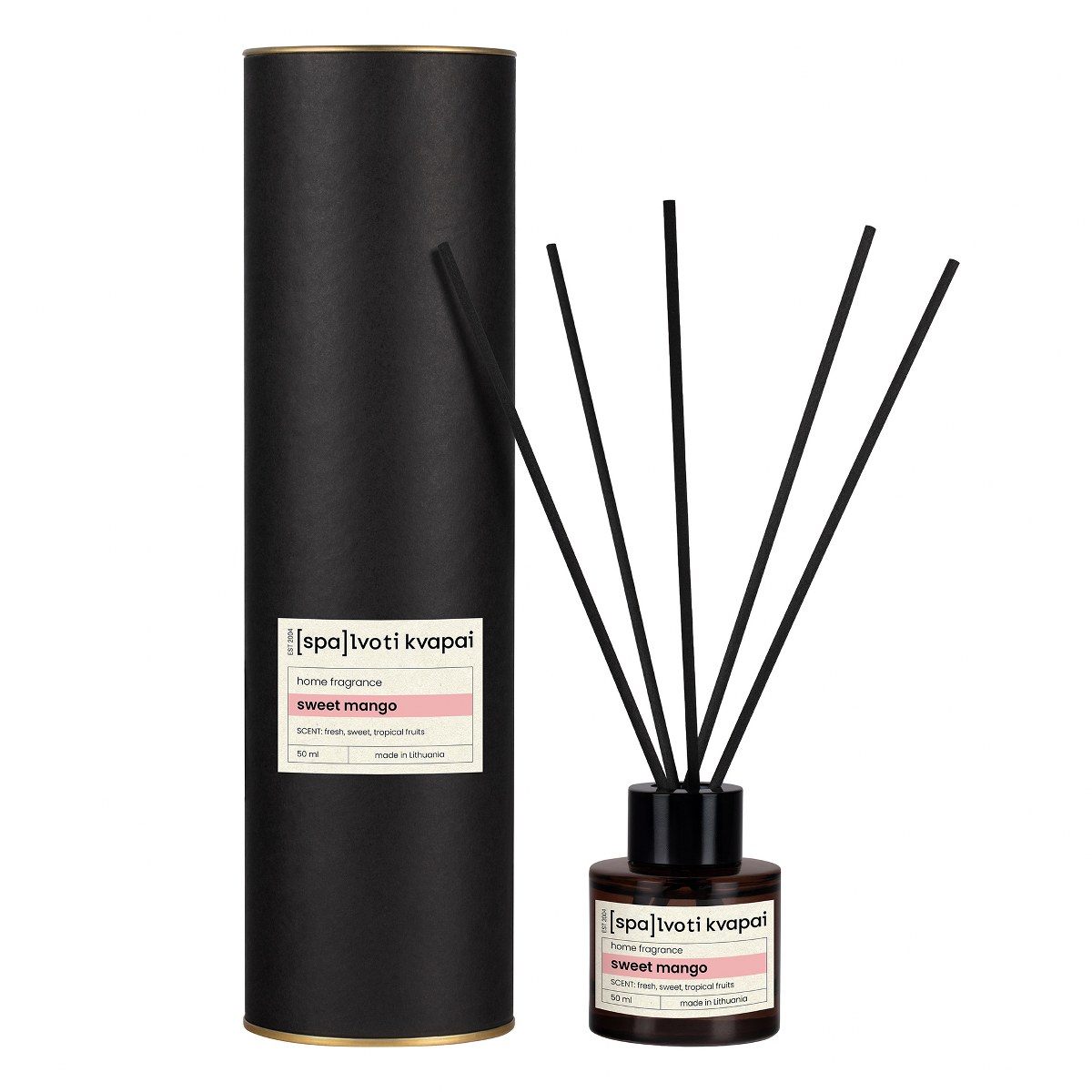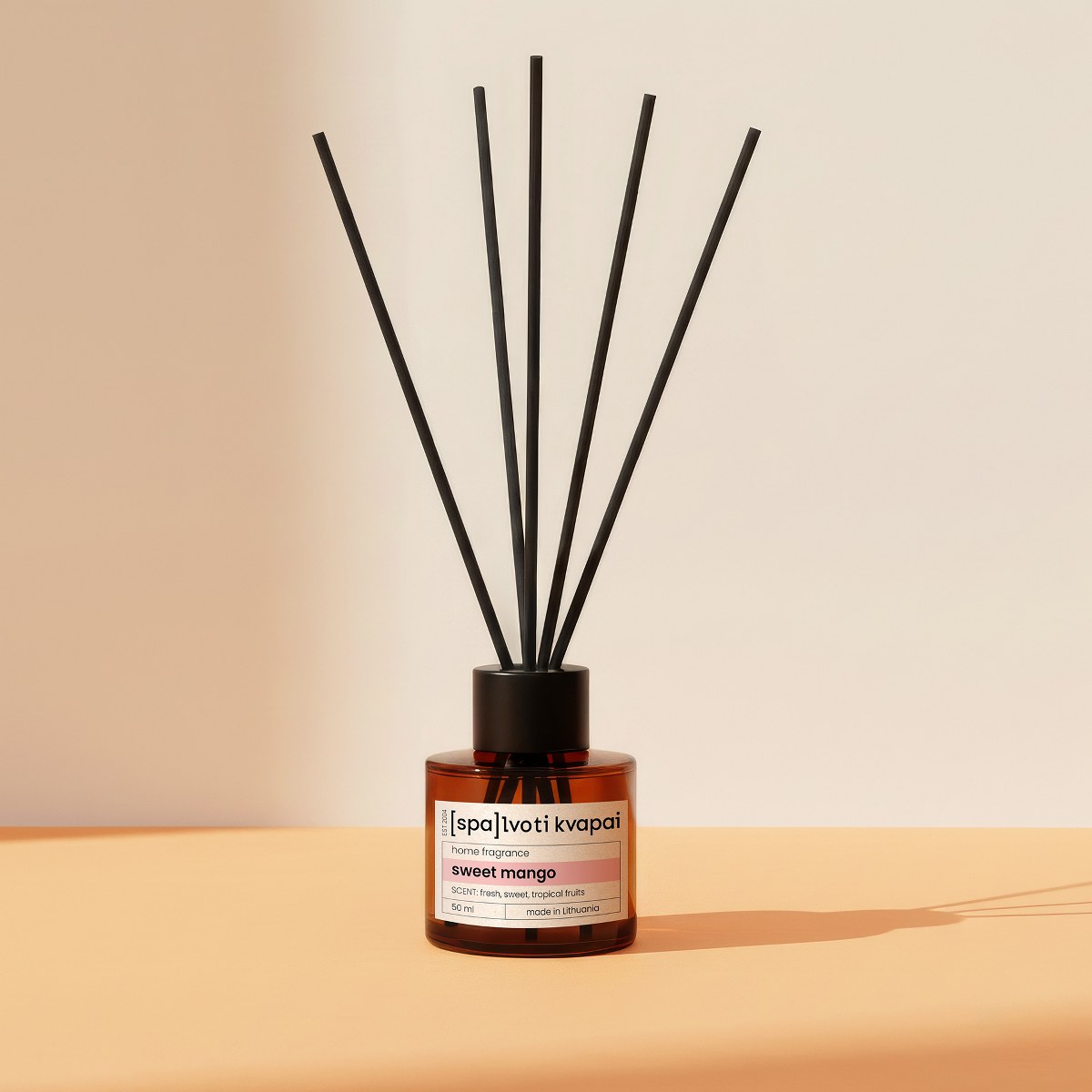Dlaczego warto wybrać dyfuzory Spalvoti Kvapai? To naturalna i trwała alternatywa dla aerozoli. Dyfuzor uwalnia zapach w sposób ciągły, bez konieczności Twojej ingerencji. Dzięki zastosowaniu specjalnych czarnych patyczków oraz wysokiej jakości olejków, aromat mango rozchodzi się równomiernie, nie przytłaczając, lecz odświeżając przestrzeń przez całą dobę.
